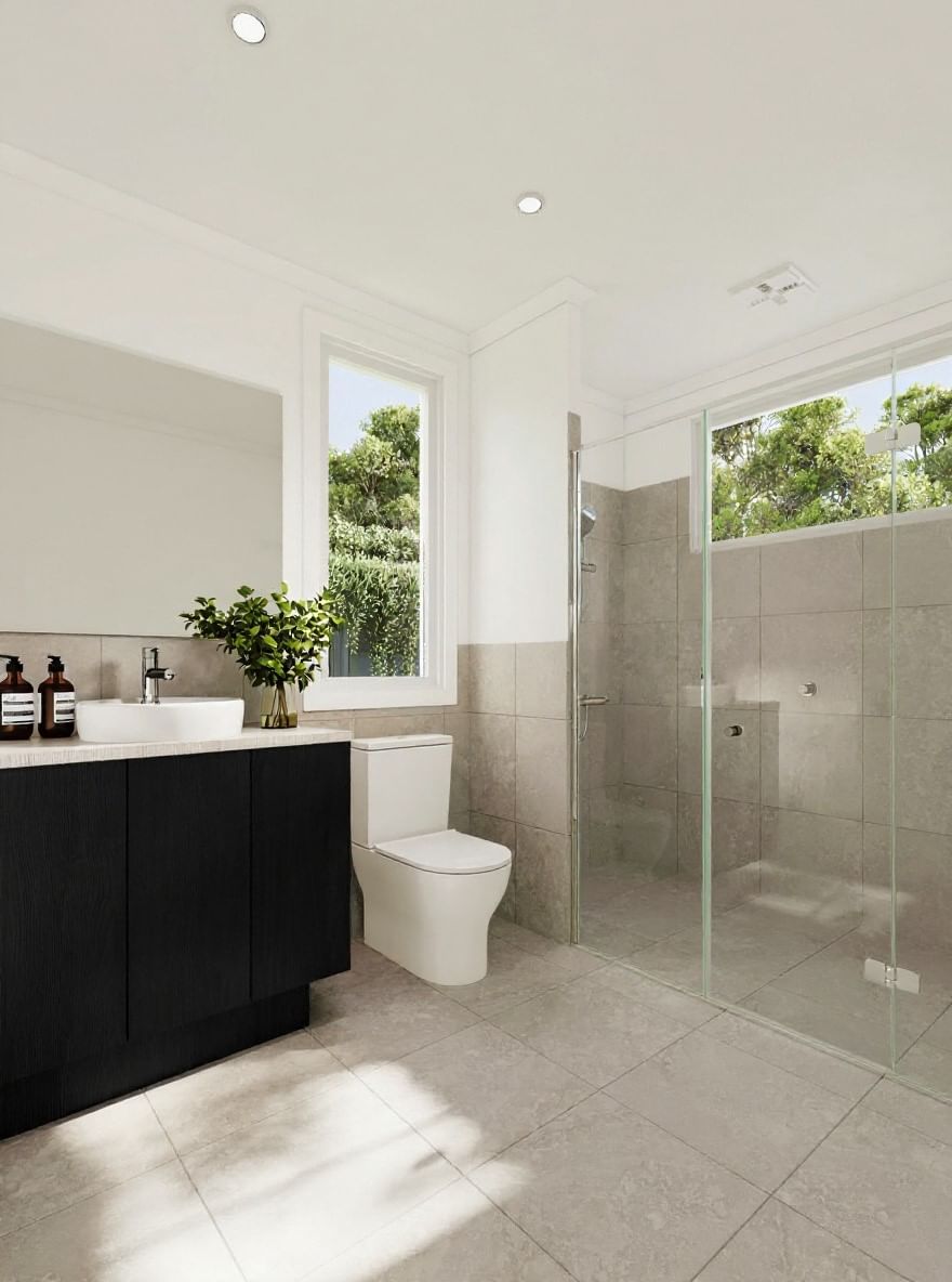 - Bathrooms with large semi-frameless showers and designer tapware