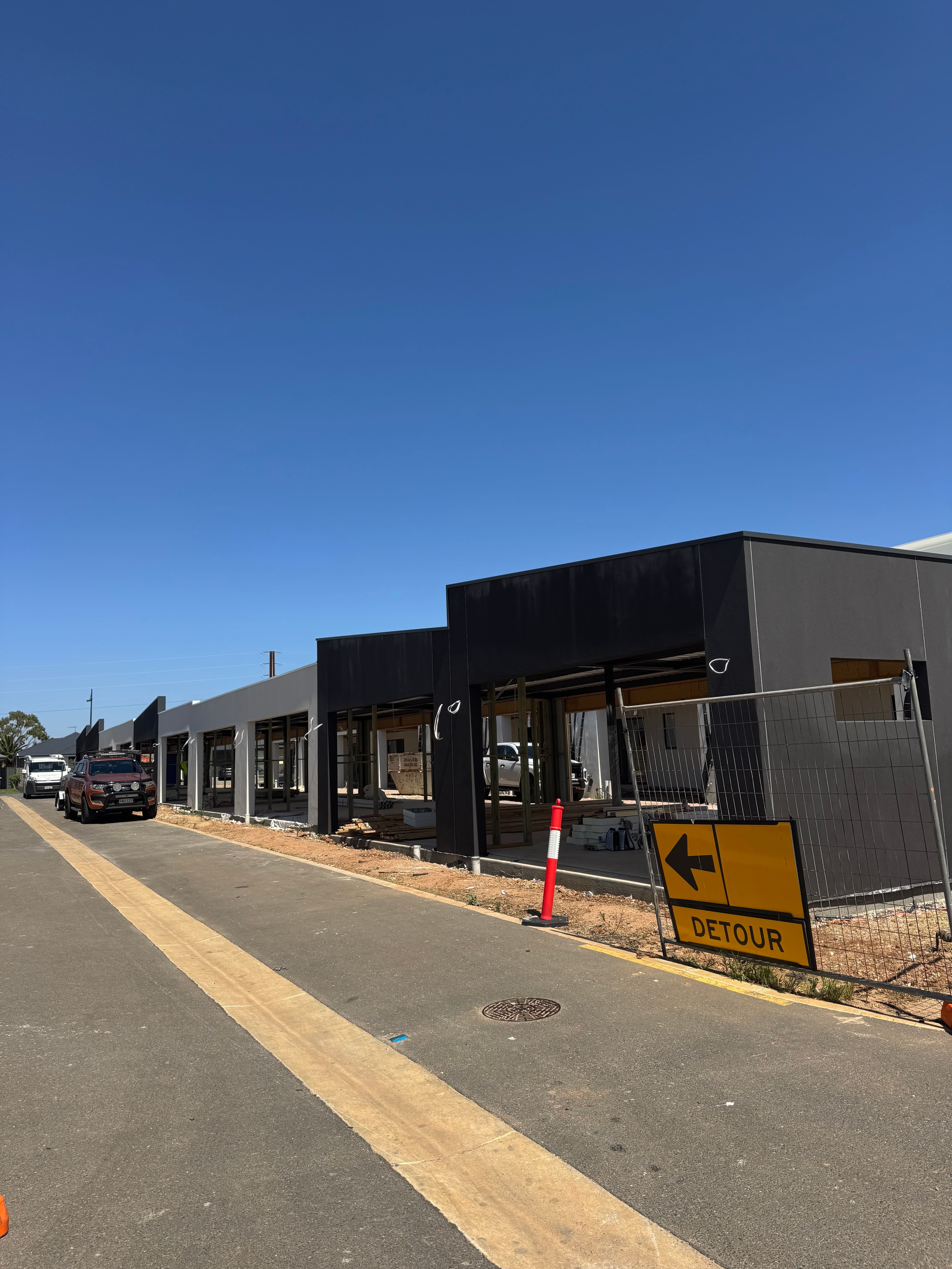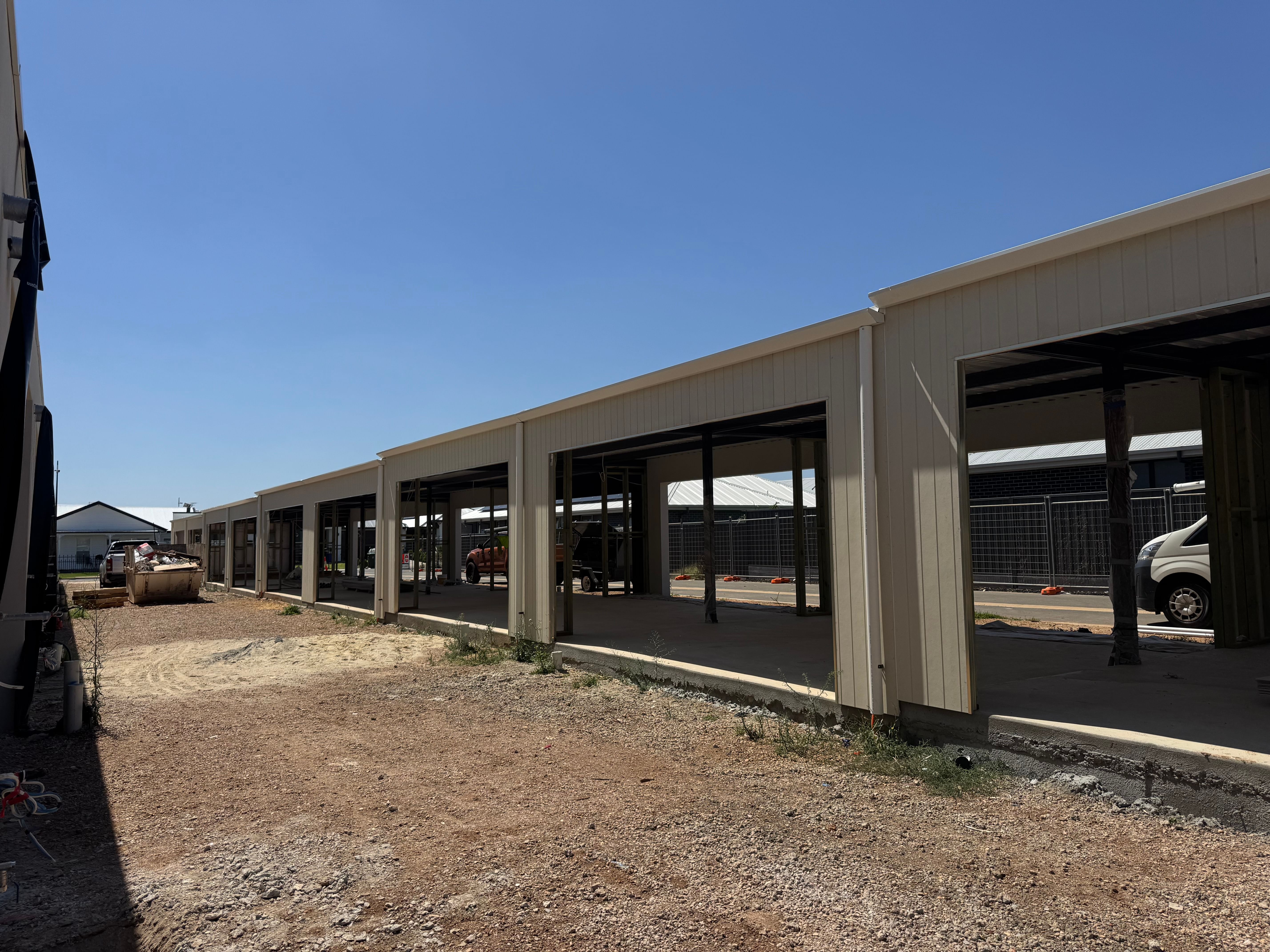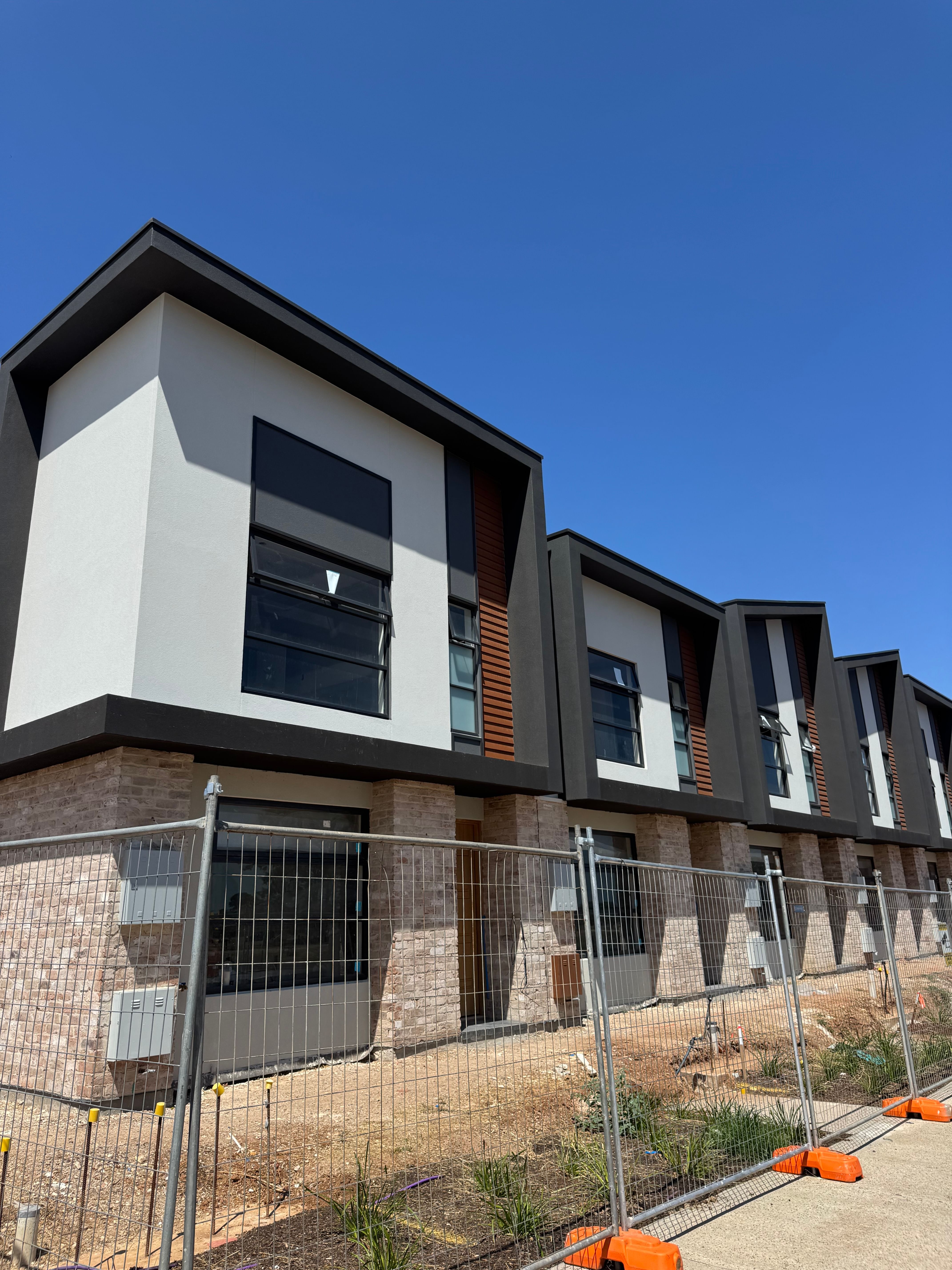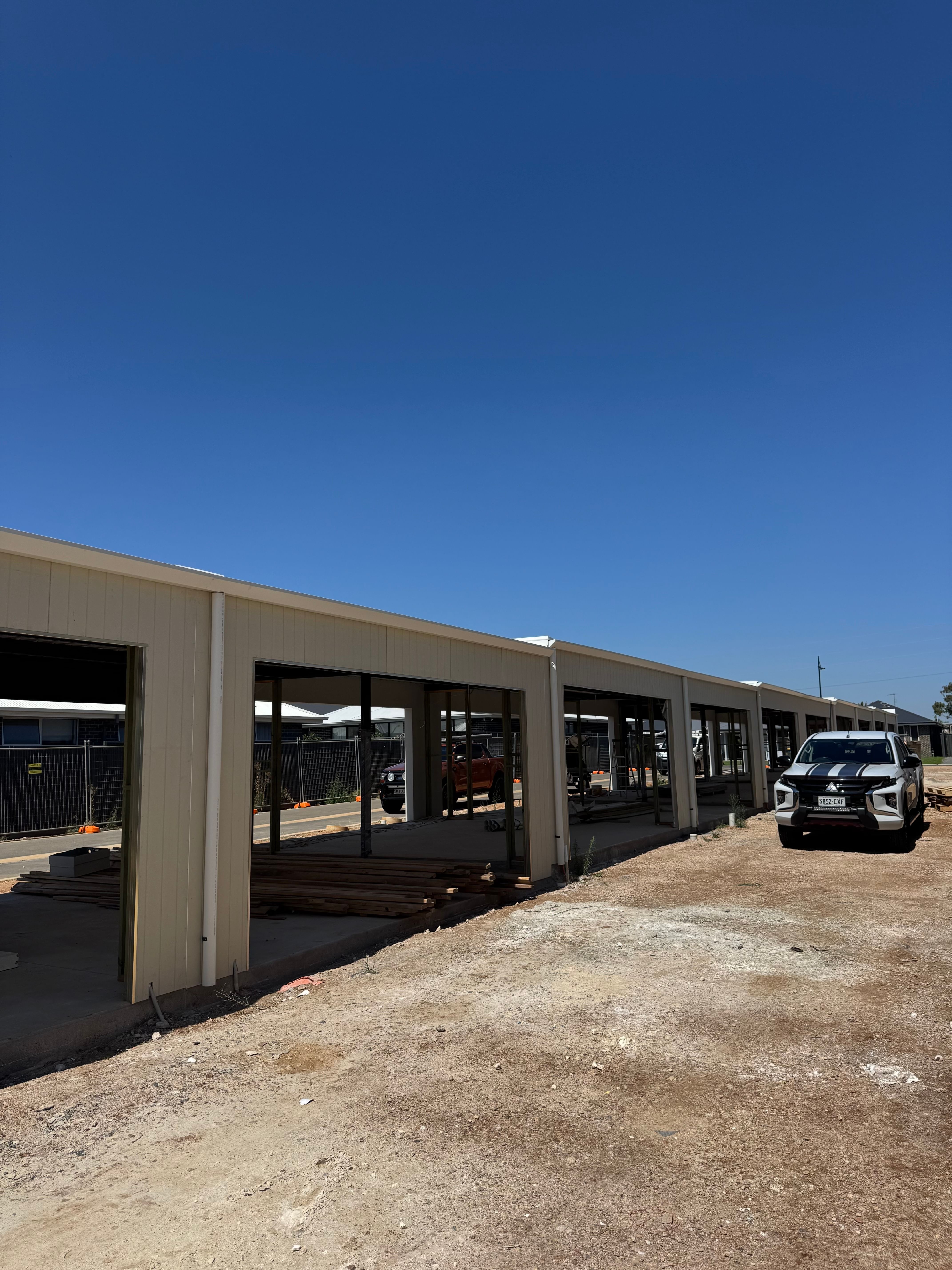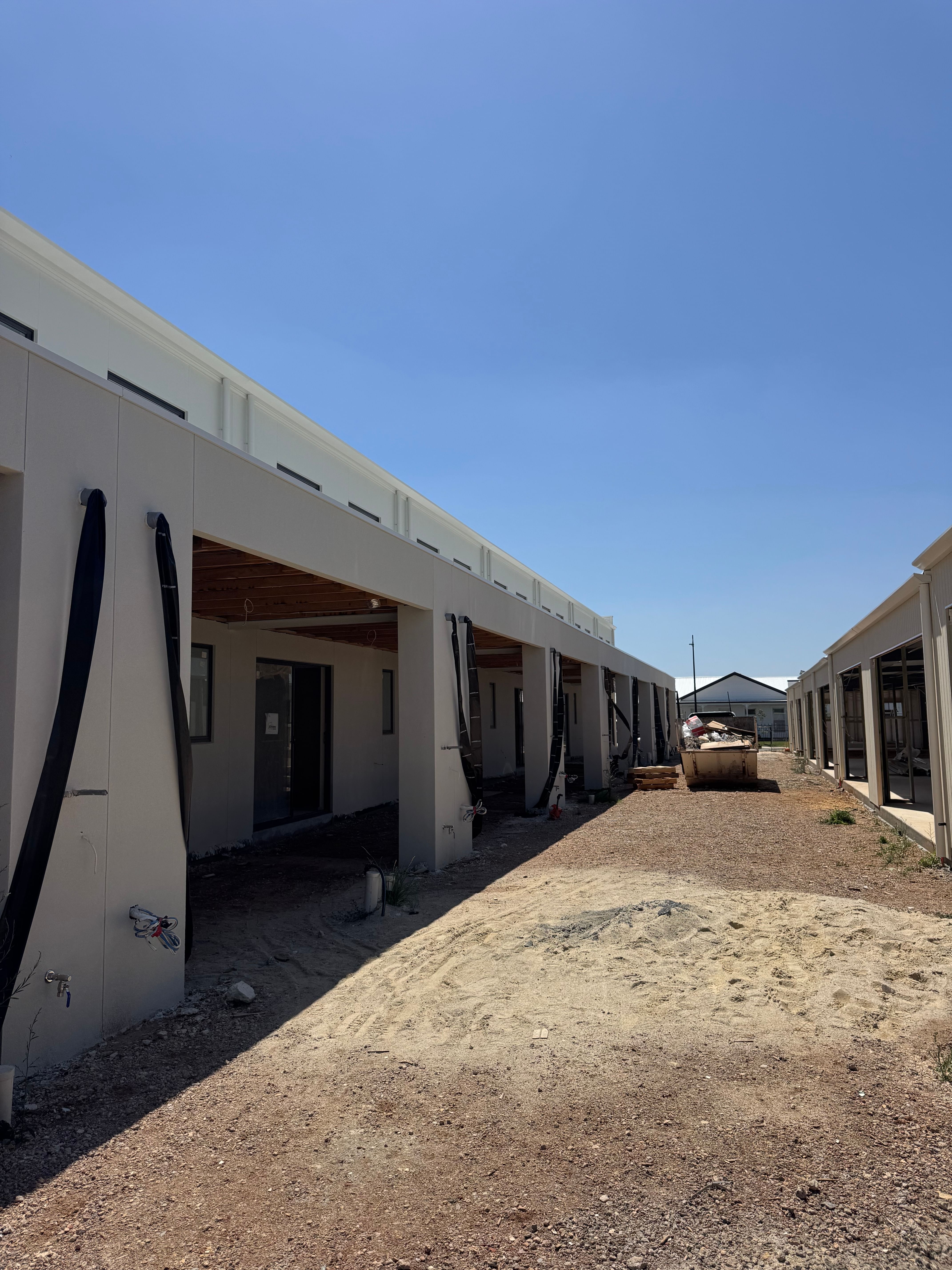 Over the past few weeks, significant progress has been made across the development. Lightweight cladding and roller doors have been installed in the carports, giving the exteriors a more defined and finished appearance. Rendering has also been completed, helping to bring the architectural design of the homes to life.